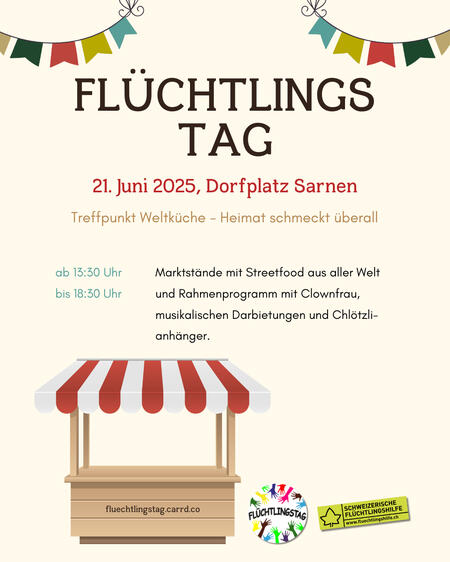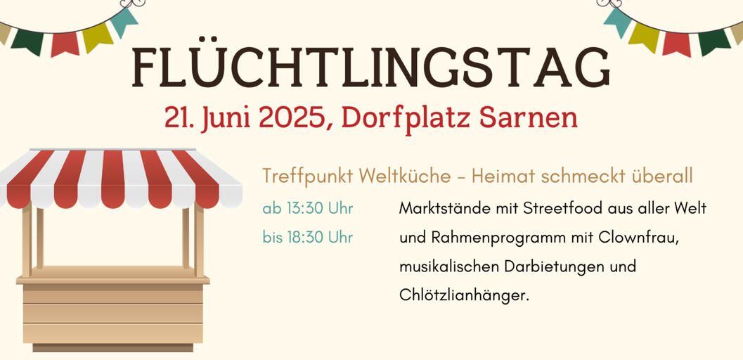 «Treffpunkt Weltküche – Heimat schmeckt überall» Mit dieser Aussage tritt der nationale Flüchtlingstag am 21. Juni 2025 in Obwalden auf.Der Treffpunkt der Weltküche ist in diesem Jahr der Dorfplatz in Sarnen. Am Nachmittag vom 21. Juni 25 ab 13.30 Uhr kann an Marktständen aus den verschiedenen Töpfen der Geflüchteten probiert werden: Welche Gewürze braucht die Küche aus Afghanistan? Mit welchem Getreide ist das Nationalgericht der Menschen aus Eritrea zubereitet worden? Und was genau ist wohl in den Häppli aus Syrien? Auch Handwerkliches aus der «Werk-Küche» eines Integrationsprojektes der Sozialen Dienste Asyl wird angeboten.Das OK des Vereines Flüchtlingstag-Begegnungstag hat bewusst für diesen Tag den Platz mitten im Dorf mit Marktständen gewählt. In allen Ländern und Kulturen gibt es Märkte. Hier wie dort treffen sich auf dem Markt Menschen: Kleine und Grosse, Junge und Alte, Familien und Einzelne, Arme und Reiche, Glückliche und Unzufriedene. Hier wie dort kommen sie regelmässig zusammen, um Ware des täglichen Bedarfs an Ständen zu kaufen. Der Markt ist ein Treffpunkt im Alltag. Der Markt bietet Platz für viele unterschiedliche Menschen.Diese Vielfalt, die unterschiedlichen Farben, Bedürfnisse und Angebote eines Marktes symbolisiert das Zusammenleben und Zusammenwachsen der Gesellschaft. Darauf will der Flüchtlingstag einmal im Jahr aufmerksam machen. Vielfalt wird als Stärke wahrgenommen: Das Einbeziehen von Geflüchteten bereichert kulturell und sozial. Die unterschiedlichen Perspektiven und Erfahrungen können zu anregenden Begegnungen und einem dynamischen Miteinander führen. Dies unterstützt auch das Thema der Schweizerischen Flüchtlingshilfe (SFH) für diesen Tag: «Zusammen leben - zusammen wachsen: Wir können Integration – lasst uns die Erfolgsgeschichte weiterschreiben». Das SFH zeigt sich für die gesamtschweizerische Organisation dieses Tages verantwortlich.Alle, welche mit Geflüchteten zusammenarbeiten und zusammenleben, sind sich einig: Durch den Austausch von Kultur und Tradition wird ein gegenseitiges Verständnis entwickelt. Dies scheint in der heutigen Zeit eine immer grössere Bedeutung zu erhalten.